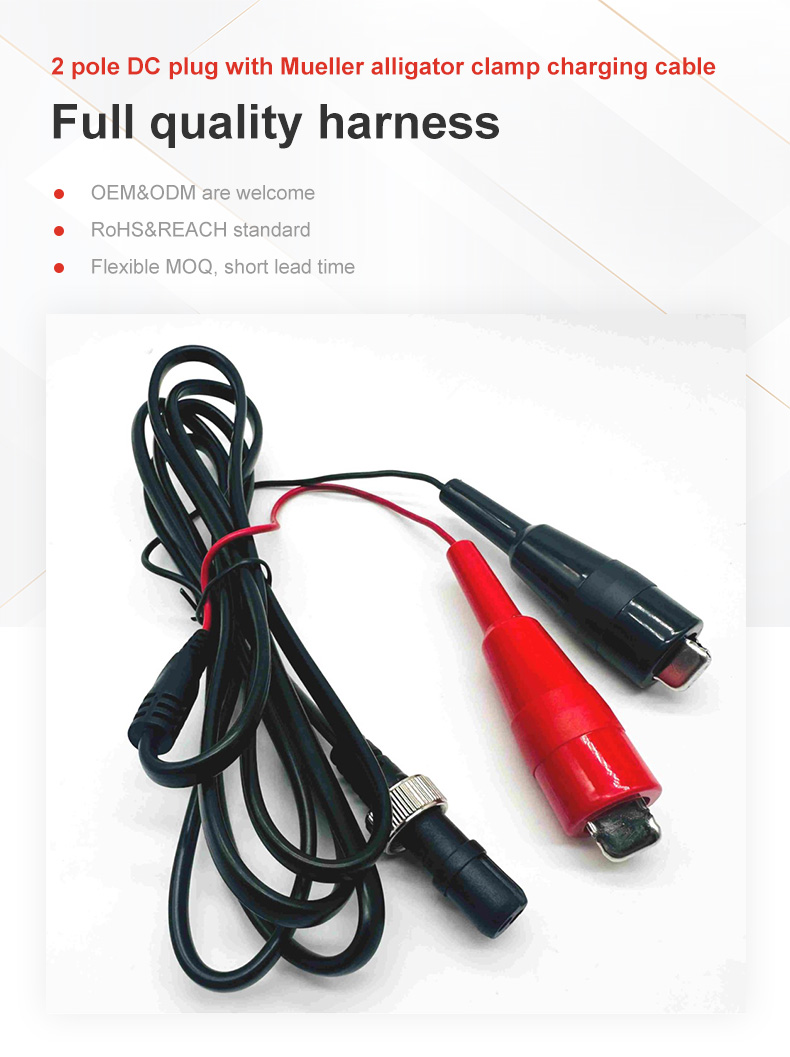 Meet diverse power needs with our high-performance 2-Pole DC Plug with Mueller Alligator Clamp Charging Cable, engineered to serve as a reliable Automotive Harness for batteries, solar panels, and vehicles. Designed for extreme conditions, this cable operates seamlessly across a temperature range of -40℃ to 105℃, making it ideal for motorcycles, lawn mowers, ATVs, RVs, boats, trolling motors, and tractors. With reinforced clamps for enhanced durability and performance, this Car Charging Cable ensures secure connections and efficient power transfer even in demanding environments. Each unit undergoes full inspection and 100% electrical testing and complies with RoHS & REACH standards, guaranteeing safety and reliability.